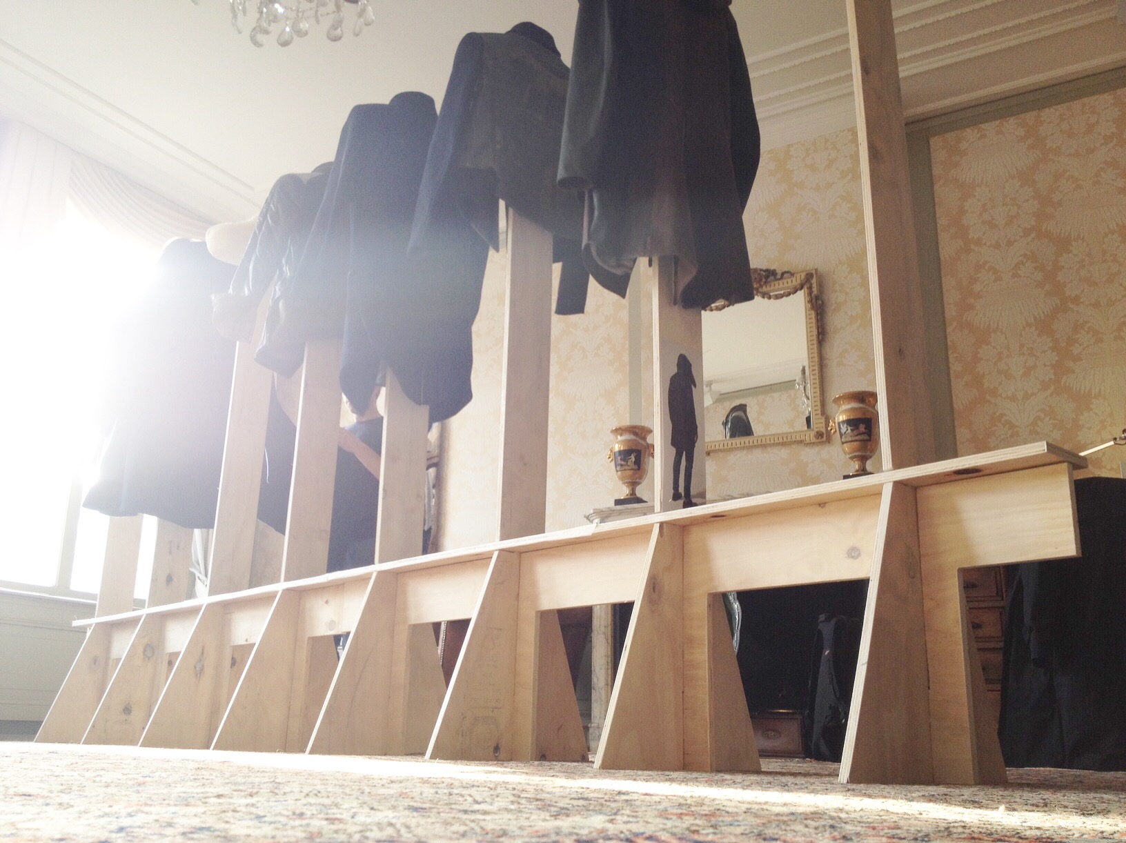 Een modulair kledingrek. Ontworpen en op maat gemaakt van hout in opdracht van een Nederlands modeontwerper voor presentatie van een nieuwe collectie tijdens Amsterdam Fashion Week in het Geelvinck Hinlopen Museum.