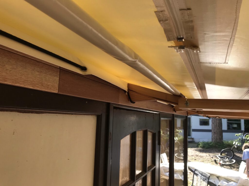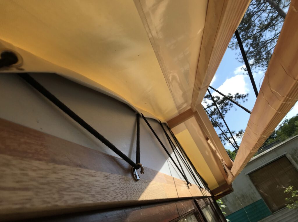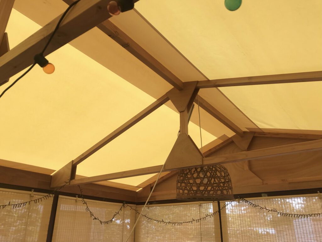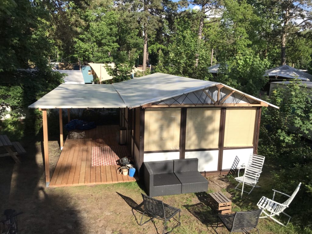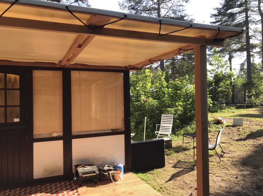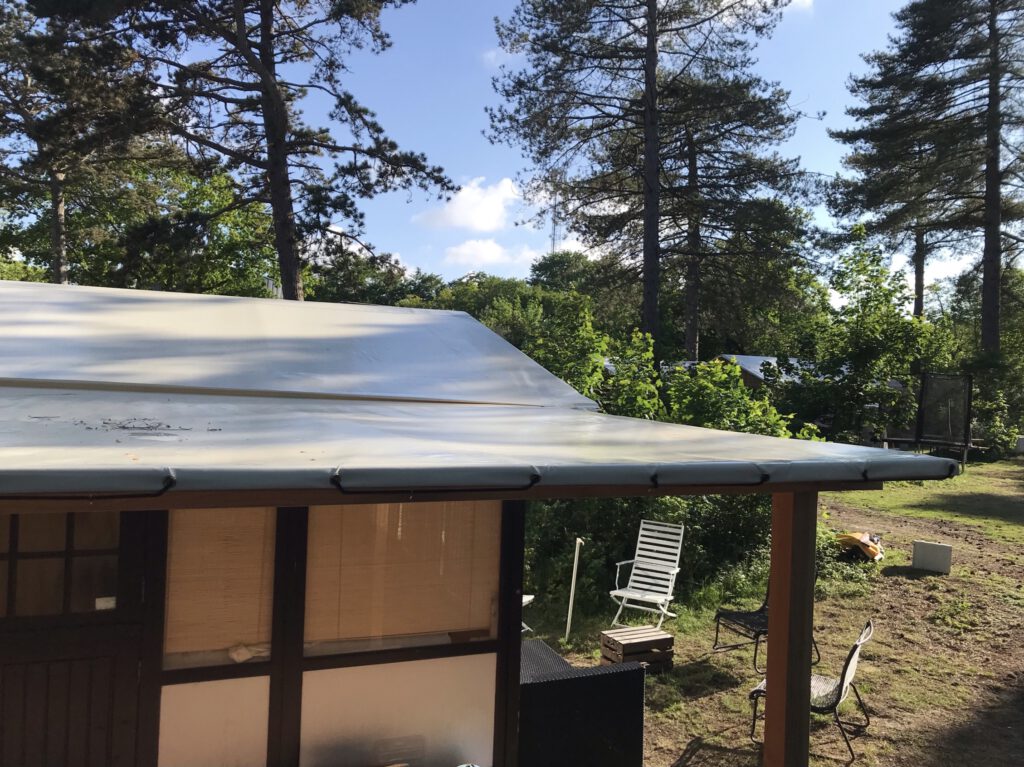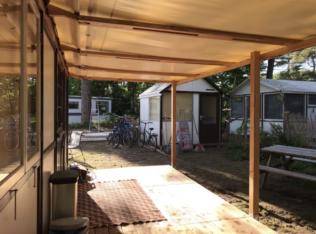 Een dak en veranda afdekking van duurzaam zeildoek. Ontworpen en op maat gemaakt voor een klassiek houten vakantiehuisje op Camping Bakkum.
