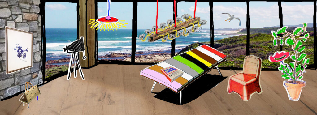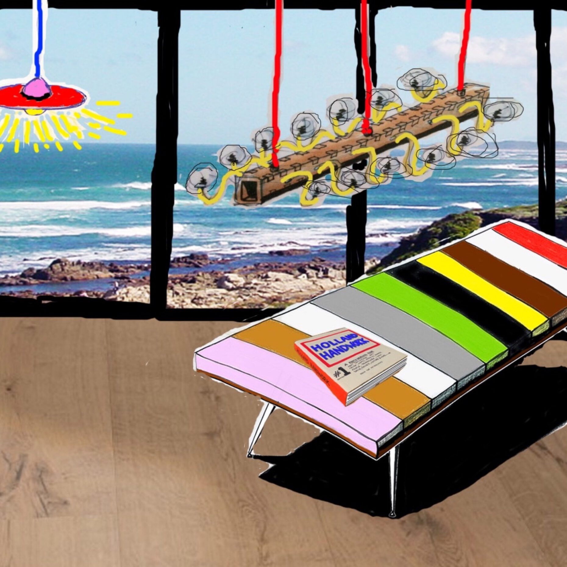 Ontwerpschets voor een appartement met uitzicht op zee. De schets bestaat uit de concept vormgeving van het appartement, ontwerp van de verlichting en het meubilair.