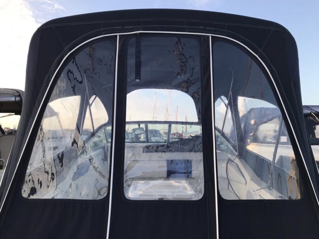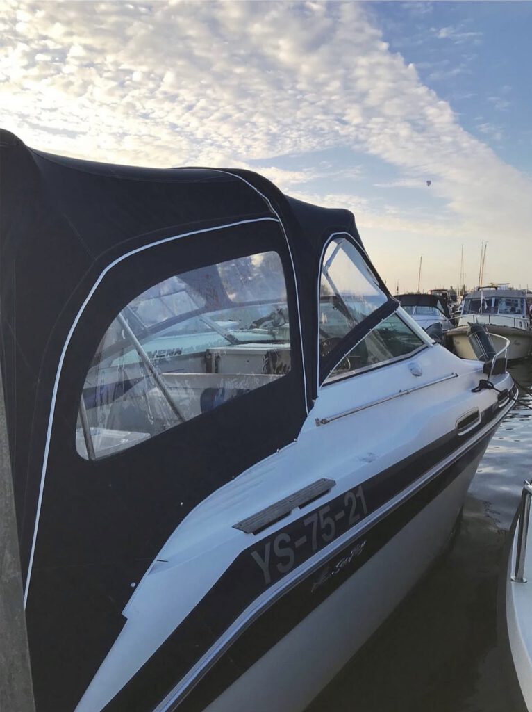 Nautisch Maatwerk speedboot kap restauratie alle ramen vernieuwd van blauwe naar witte bies volledig doorgestikt scheuren gerepareerd gewassen en geïmpregneerd levensduur verlengd