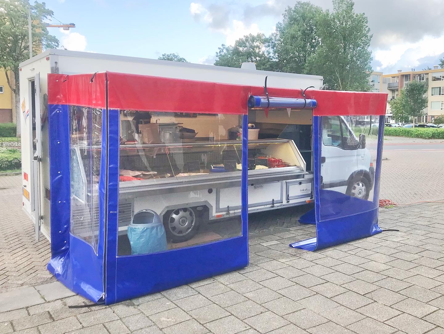 Een voortent voor een viskraam ontworpen en op maat gemaakt met gebruik van outdoor zeildoek.